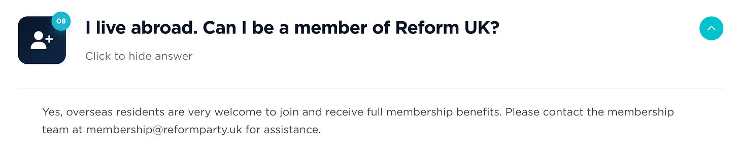 “Overseas residents are very welcome to join and receive full membership benefits,” Reform’s website states.